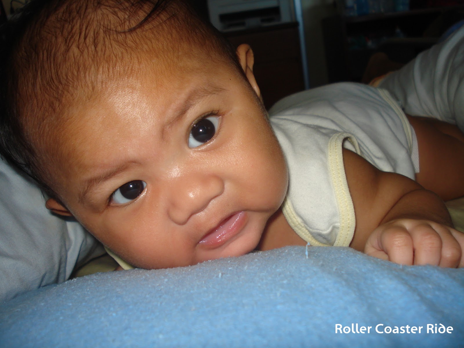 This Day 114 photo was taken when Ziggy just woke up. He was sleeping on his tummy (with careful supervision, I might add). So, here he was pulling his head up so that he can get out of the position he was in. He usually hates prolonged tummy time.