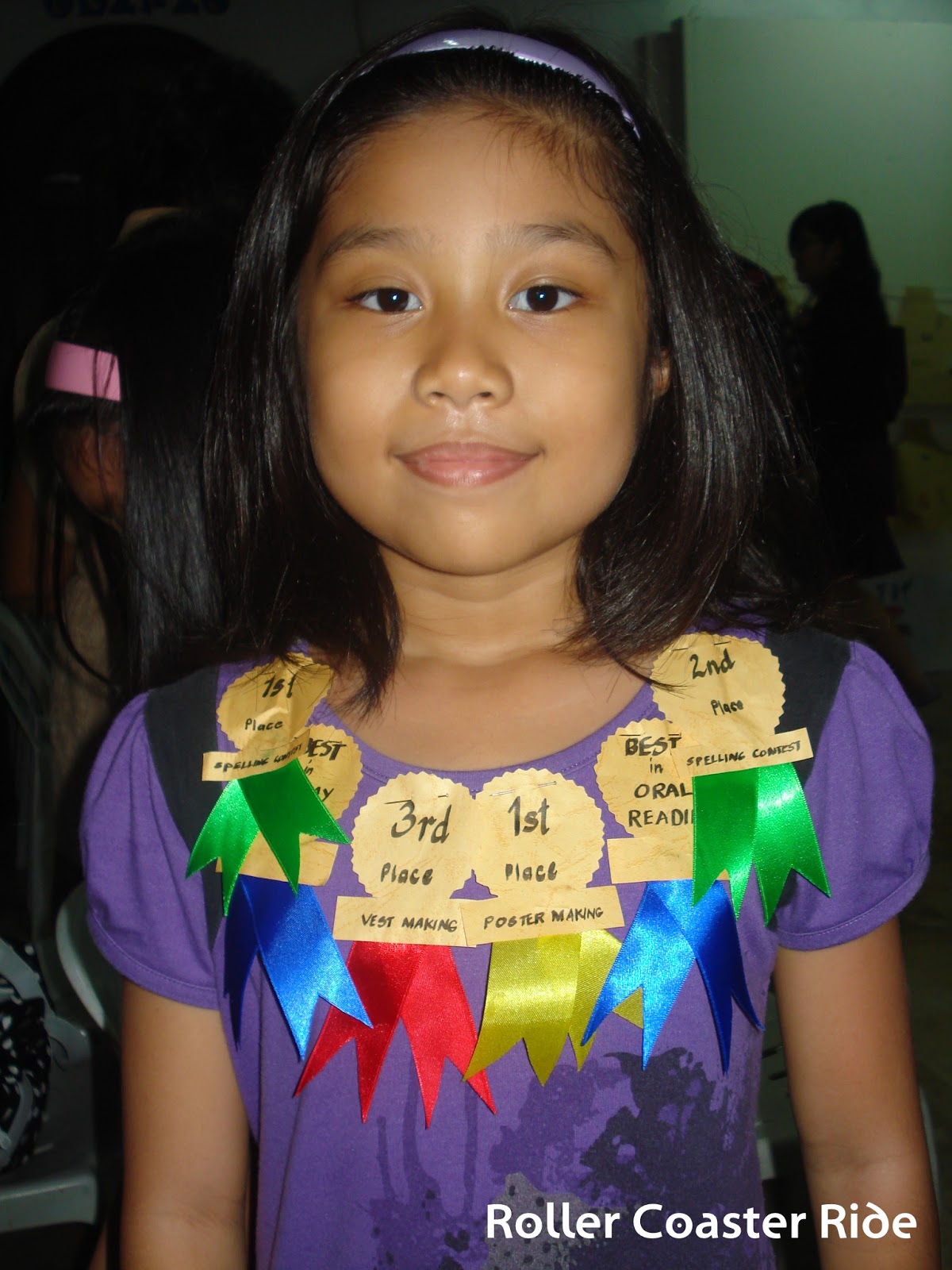 During the awarding of the contest winners, the parents of the winners were asked to come up on stage to pin the ribbons on their kid. I hardly left the stage because as expected, Zoe placed on most of the contests. She won 1st Place in Poster Making, 3rd Place in Vest Making, 1st Place in the Spelling Contest among the fourth graders and 2nd Place in another Spelling Contest when she was asked to compete with a sixth grader. Aside from that, Zoe was also Best in Essay Writing and Best in Oral Reading. Oh, I am one proud Mommy. Like mother, like daughter, of course!