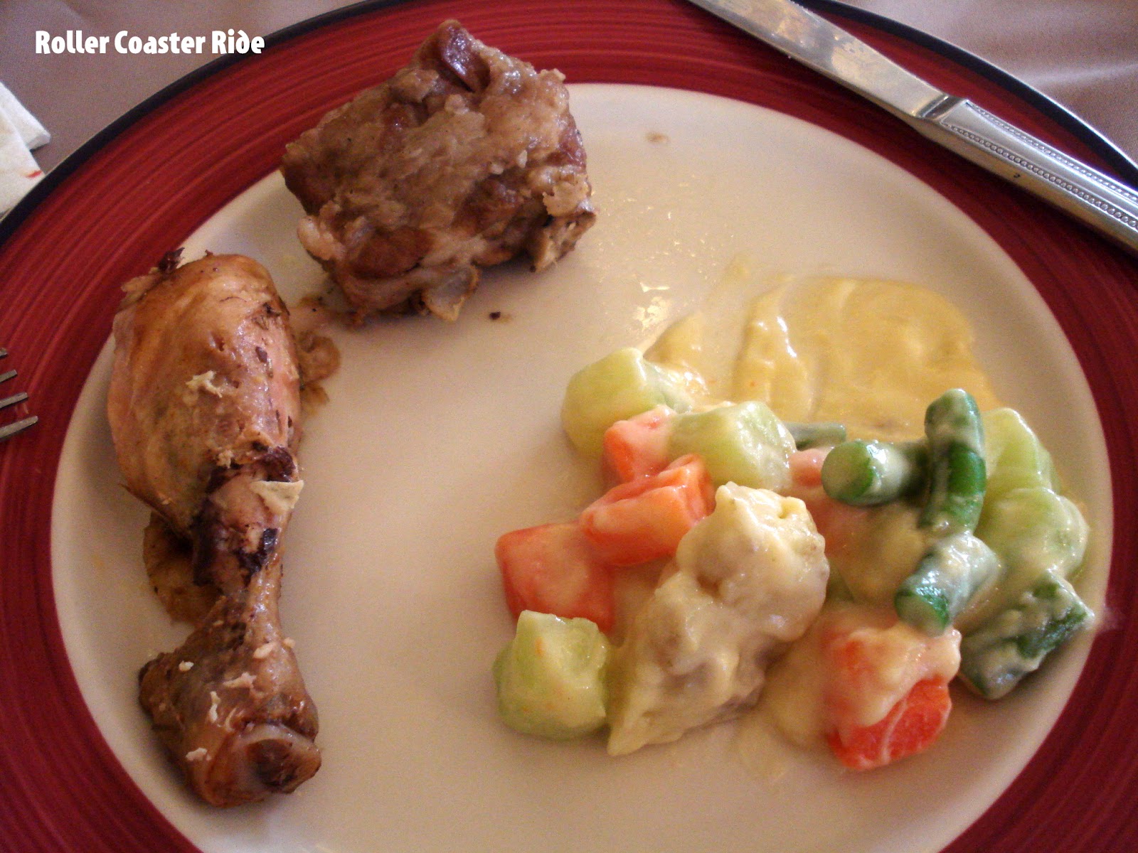 …. and this main course consisting of Roast Chicken, Pork Ribs with Black Bean Sauce (which I liked!) and Creamed Vegetables. I ate some dessert too but wasn’t able to take a photo.