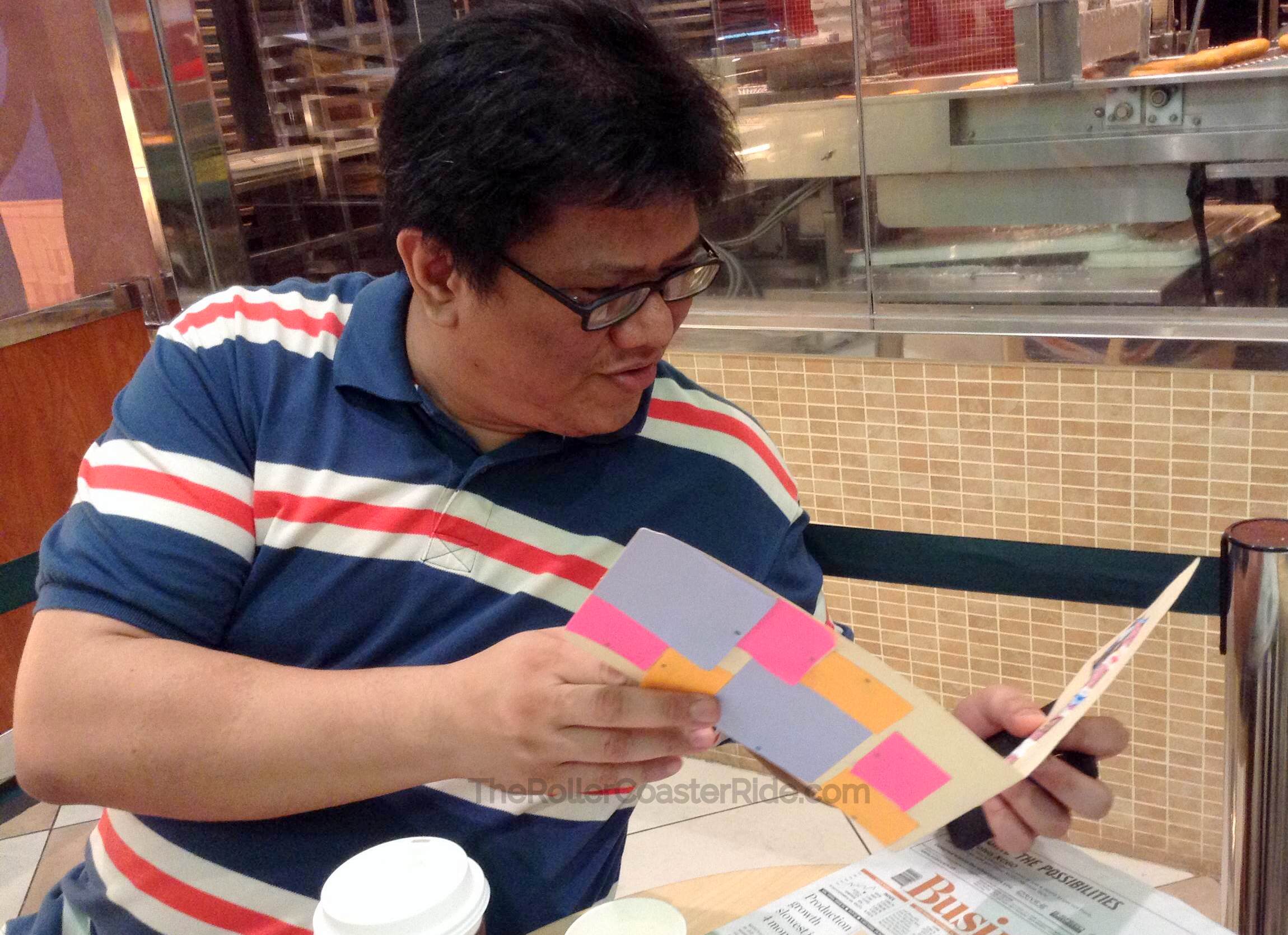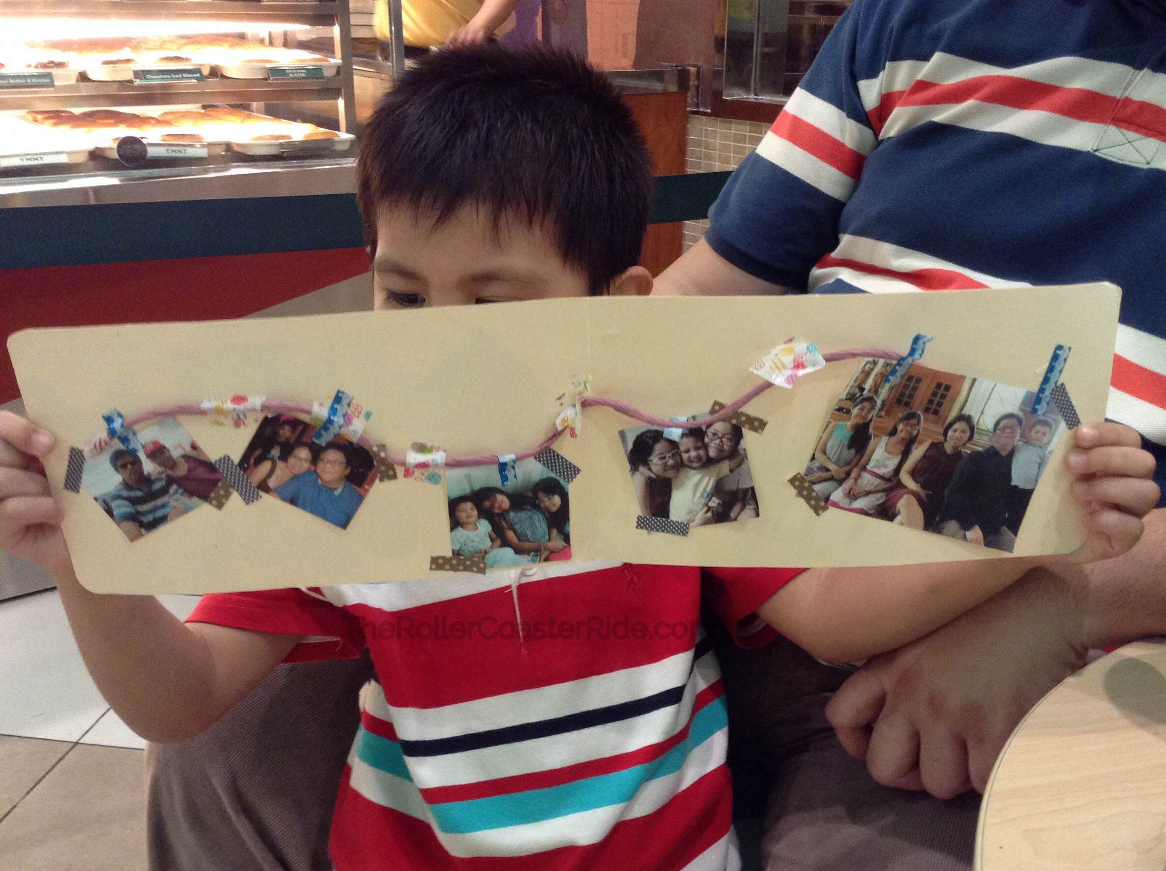 Then, we found ourselves at Krispy Kreme where the girls and I ended up just having hot choco and coffee. Hubby and Ziggy had donuts. This is where Zoe finally gave Kai her birthday gift for him, which was this card she made the day before. It was made of a folder, photos, washi tape and twine. At the back, there are several sheets of sticky notes which reveals several short messages.