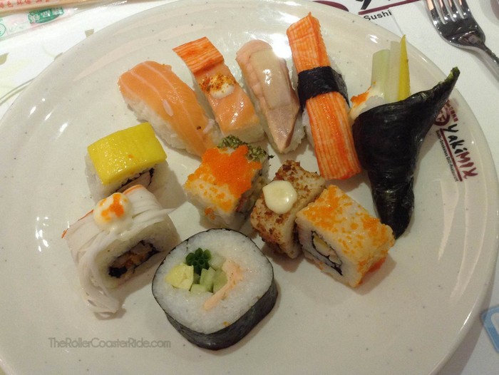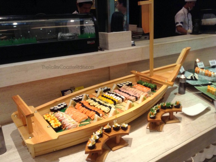 Then of course, I had to get a lot of sushi too. Take a look at that sushi boat! My girls also love sushi so this was their first stop at the buffet.