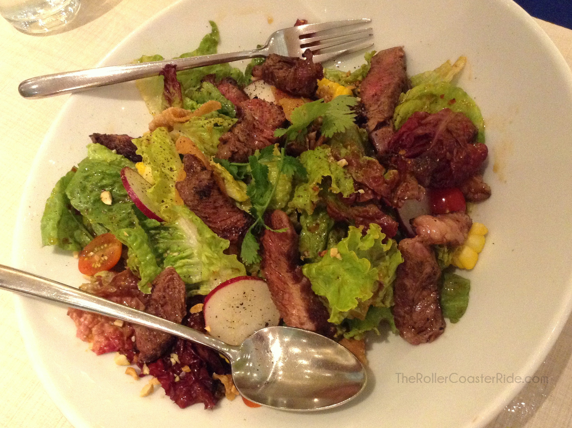 Hubby has been ordering mostly salads recently whenever we go out. So it was not surprising that he ordered this Asian Steak Salad. It’s made of seared rib eye steak tossed with fresh greens, sweet corn, crisp wontons in an Asian style sweet-savory dressing. I love steak and so I was mostly pleased with this dish. I just wish the dressing wasn’t so citrusy.